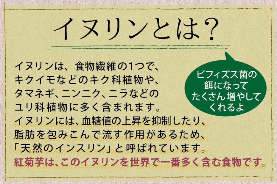 イヌリンという成分が含まれており、体内のインスリン分泌量を低くする働きや糖質を蓄積しづらい体質に変える働きをします。また、蓄積された脂肪をエネルギーに変える働きをするグルカゴンが分泌されるようになるので、リバウンドしずらいダイエットには最適です!