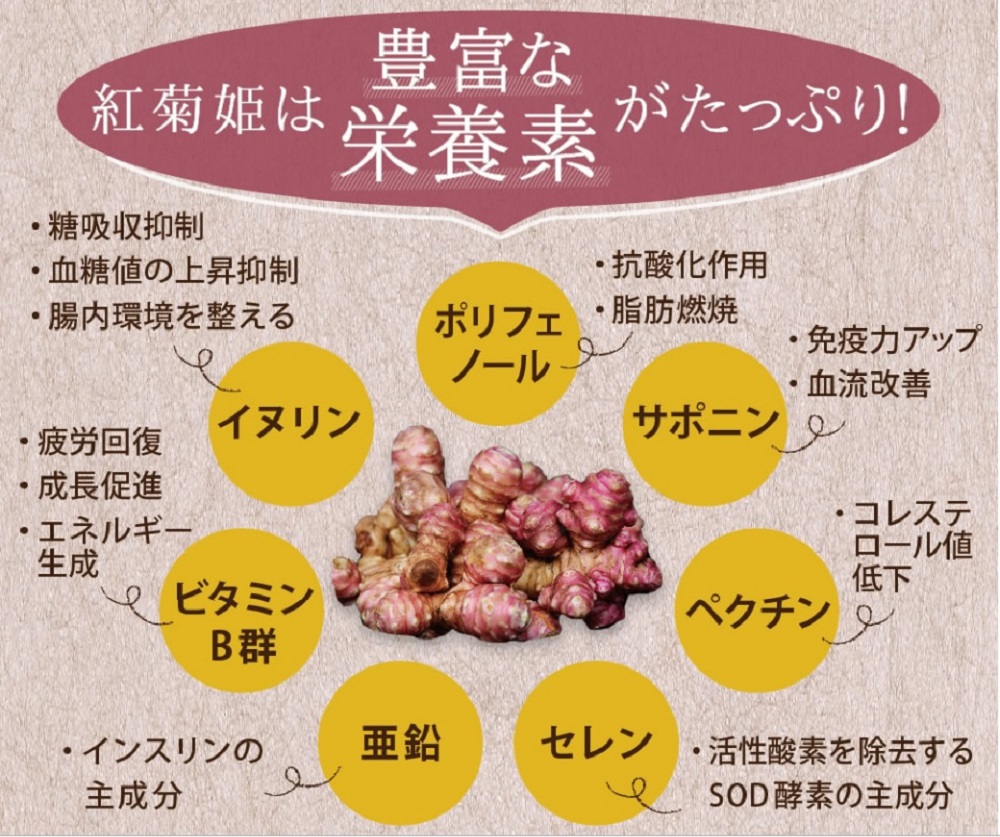 この紅菊姫®にはポリフェノール、サポニン、ペクチン、セレン、亜鉛、ビタミンB群、イヌリンといった7種類の栄養素が豊富に含まれています。中でも、「天然のインスリン」と呼ばれるイヌリンは、血糖のコントロールに大変有効であることが分かっています。